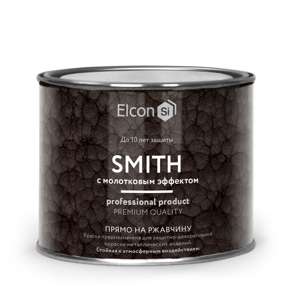 Краска Elcon Smith с молотковым эффектом предназначена для долговечной окраски металлических поверхностей снаружи и внутри помещений. Краску можно наносить на прокорродировавшую поверхность сразу после удаления рыхлой ржавчины. Компоненты, входящие в состав краски, преобразуют ржавчину в прочный защитный слой, препятствуют дальнейшей коррозии и образуют на поверхности металла прочное атмосферостойкое покрытие.