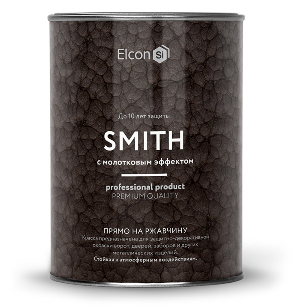 Краска Elcon Smith с молотковым эффектом предназначена для долговечной окраски металлических поверхностей снаружи и внутри помещений. Краску можно наносить на прокорродировавшую поверхность сразу после удаления рыхлой ржавчины. Компоненты, входящие в состав краски, преобразуют ржавчину в прочный защитный слой, препятствуют дальнейшей коррозии и образуют на поверхности металла прочное атмосферостойкое покрытие.