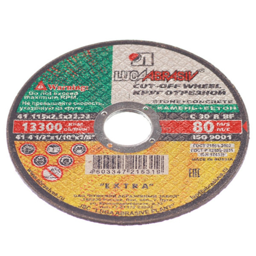 Круг отрезной предназначен для резки натурального и искусственного камня, кирпича, в том числе огнеупорного. Устанавливается на шлифмашину угловую. Зернистость - С54. Материал - C - карбид кремния черный. Связка BF - бакелитовая с наличием упрочняющих элементов.