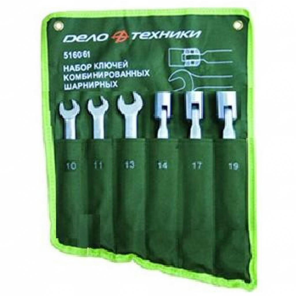 Набор комбинированных шарнирных ключей "Дело Техники" - это надежный и удобный комплект инструментов для обслуживания крепежа. Ключи изготовлены из хромванадиевой стали, которая прошла процесс холодной штамповки для увеличения твердости. Инструмент имеет рожковую головку на одном конце, на другом - торцевую головку, которая расположена на шарнире. Шарнирный механизм облегчает работу в труднодоступных местах или ограниченном пространстве.