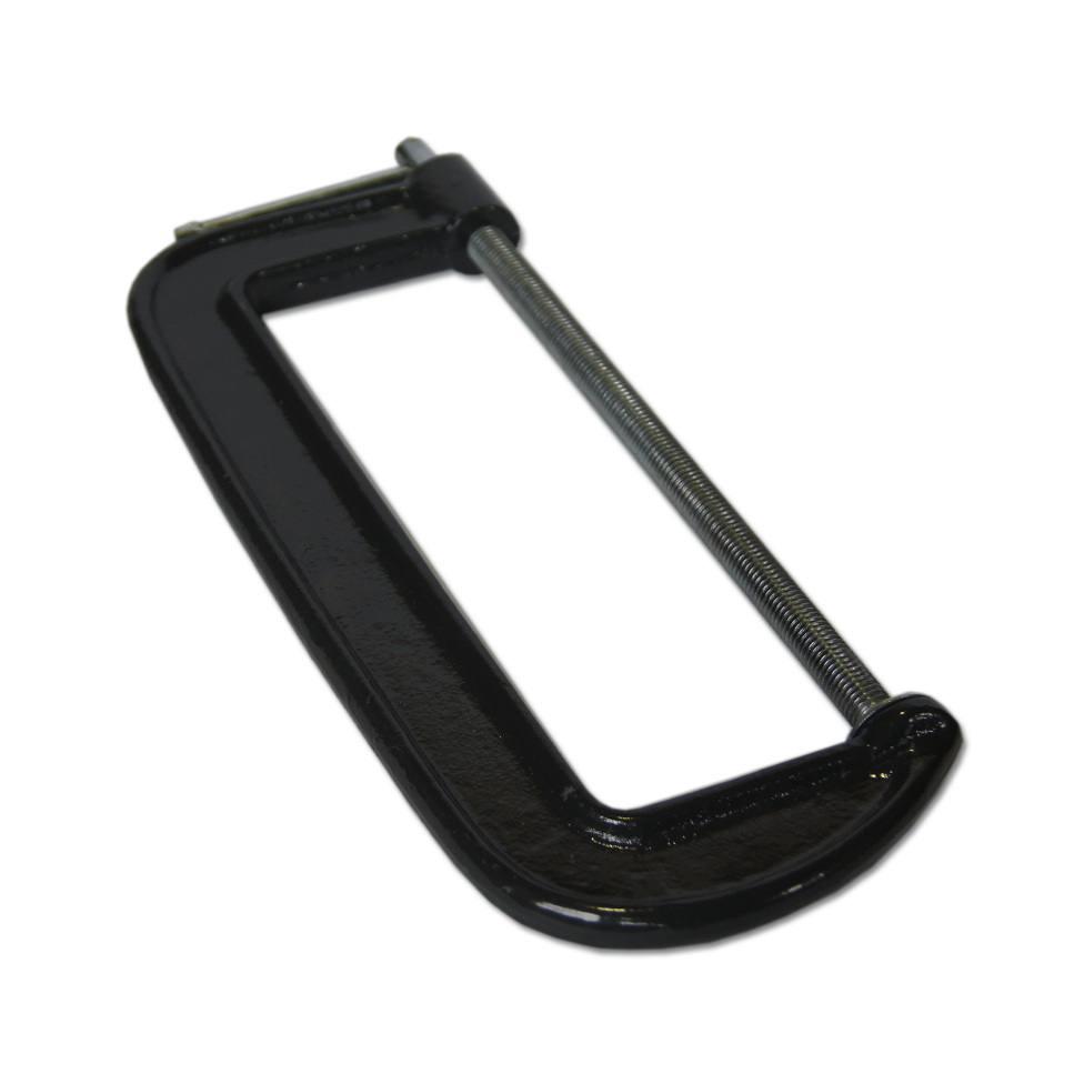 Струбцина G-образной формы изготовлена из чугуна. Рама струбцины покрыта цветным лаком. Винт струбцины со специальным зажимом и крупной червячной резьбой позволяет надежно фиксировать предметы.