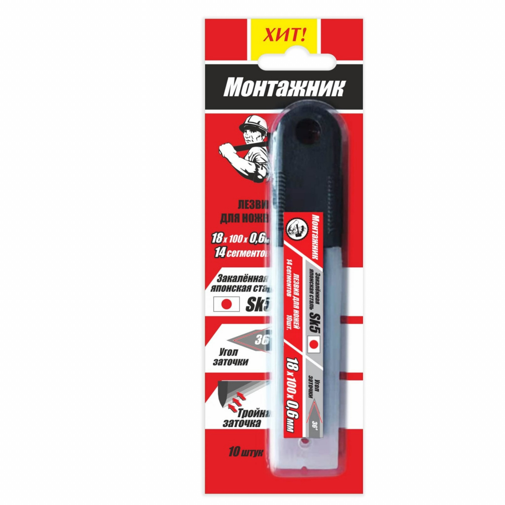 Лезвия для ножей ТМ "Монтажник" (10 шт, 18x100x0,6 мм, 14 сегментов) из высокопрочной высокоуглеродистой стали с добавками для улучшения закаливаемости SK5, которая дольше других держит заточку - минимум в двое лучше обычных лезвий.