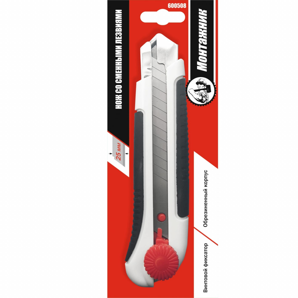 Нож универсальный со сменными сегментированными лезвиями. Корпус обрезиненный с винтовым фиксатором.