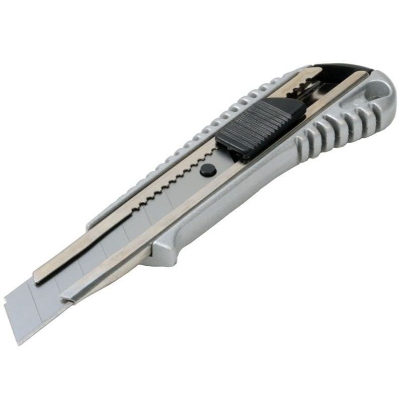 Нож технический для разрезания бумаги, кожи, резины, ткани, линолеума и др. материалов. Сегментное сменное лезвие с двусторонней заточкой из SK-5 стали.