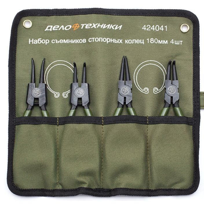 Набор съёмников, применяемых при монтаже и демонтаже внутренних и наружных стопорных колец. Съёмники снабжены возвратной пружиной для более быстрой и удобной работы.