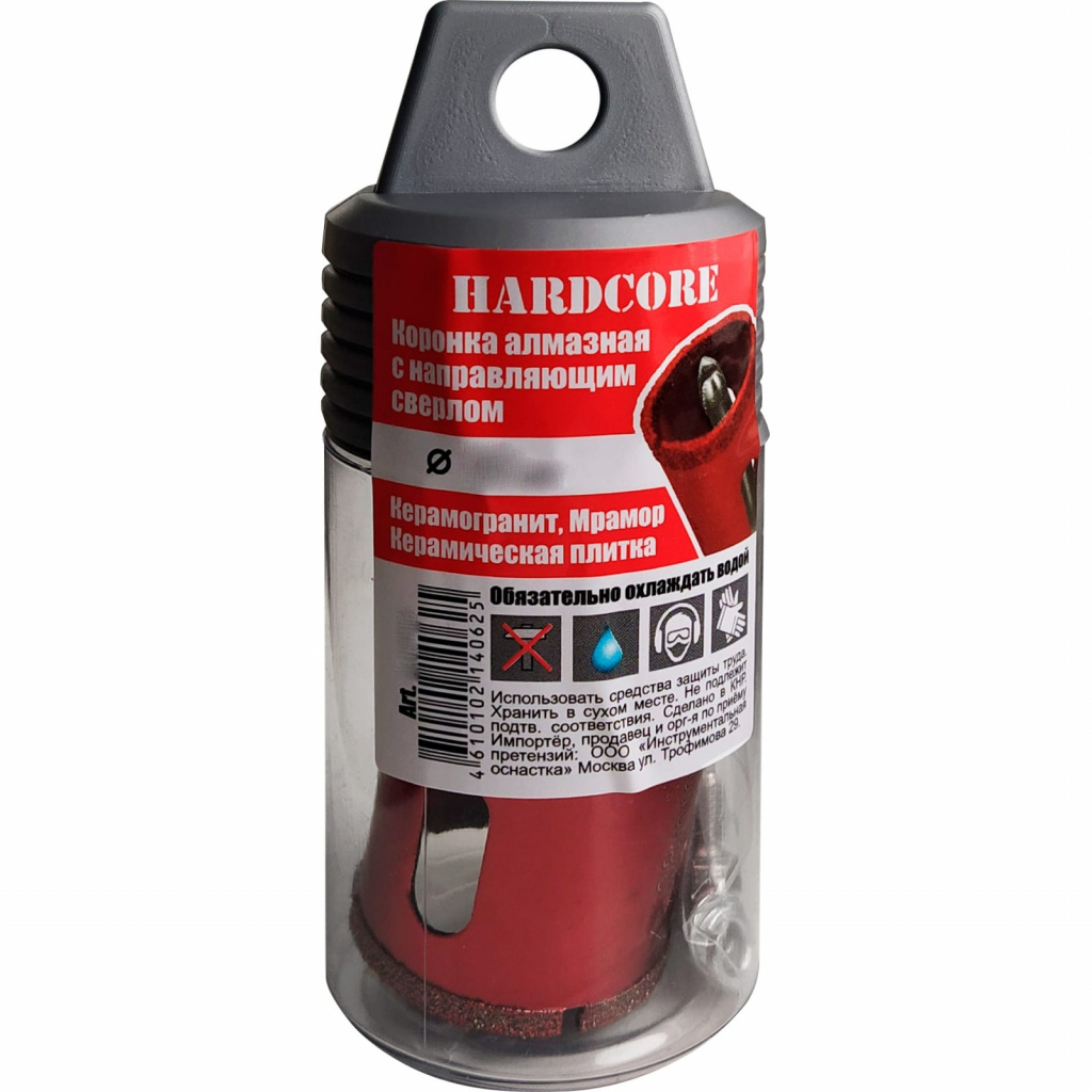 Коронка алмазная Hardcore применяется для сверления керамогранита, керамической плитки, мрамора и камня. Сверление необходимо проводить в безударном режиме с водяным охлаждением коронки и места сверления на плитке. Рабочая часть коронки выполнена из высокопрочных алмазов. Центрирующее сверло с качественной победитовой напайкой. Трехгранный цилиндрический хвостовик для надежного крепления в патроне дрели.