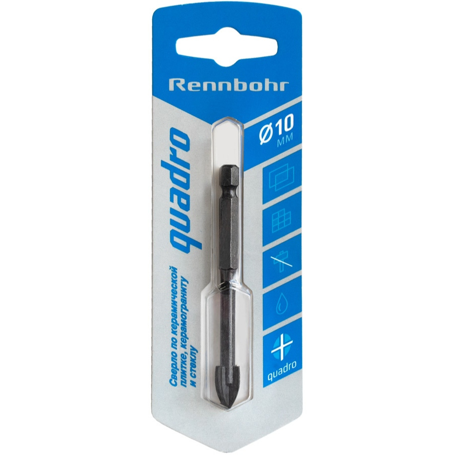 Сверло Quadro диаметром 10 мм применяется для сверления отверстий в керамической плитке 1-4 класса твёрдости, керамограните, стекле. Твердосплавная напайка изготовлена из карбид-вольфрамового сплава. Количество граней - 4. Сверление следует проводить на низких скоростях с охлаждением сверла и места сверления.