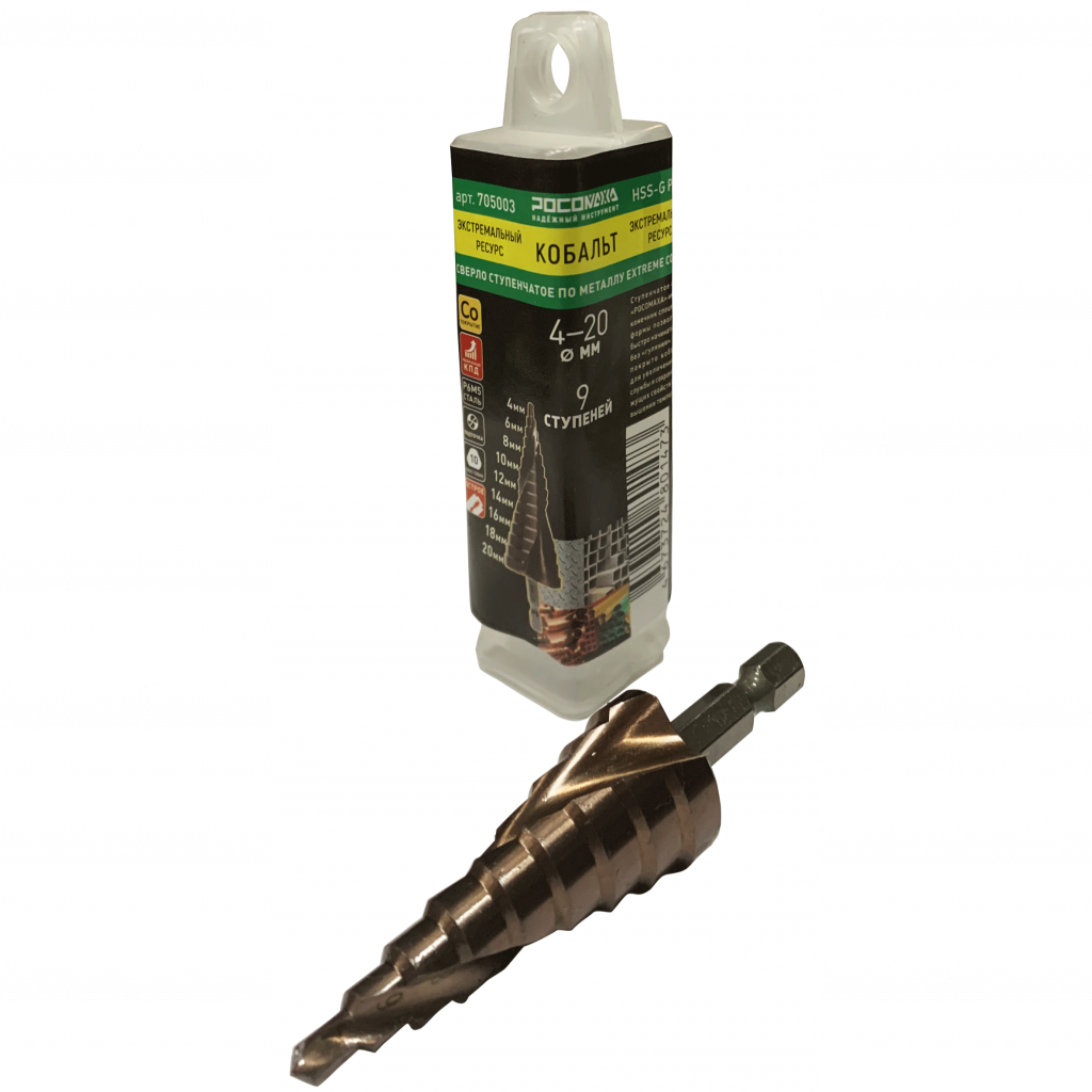 Сверло ступенчатое по металлу Extreme COBALT ТМ РОСОМАХА имеет наконечник специальной формы позволяющий быстро начинать работу без "гуляния". Сверло покрыто кобальтом для увеличения срока службы и сохранения режущих свойств при повышении температуры.