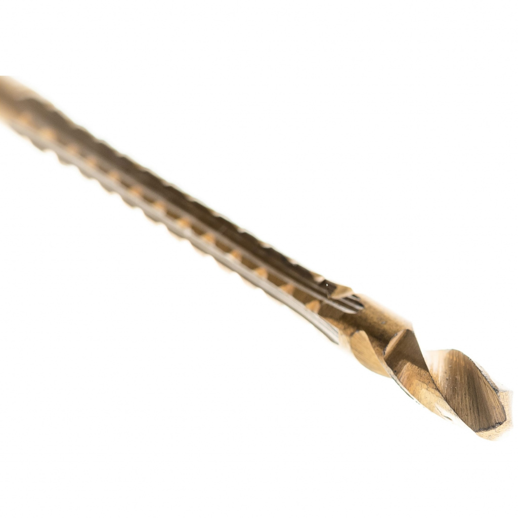 Сверло-фреза универсальное торговой марки HAGWERT с покрытием TIN изготовлено из износостойкой быстрорежущей стали P6M5/HSS-TIN. Поверхность имеет титановое напыление, для повышения стойкости режущих кромок. Предназначено для просверливания и рассверливания отверстий на произвольный больший диаметр для работ по стали, жести, дереву, пластику, гипсокартону.