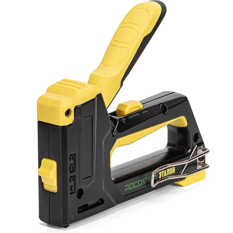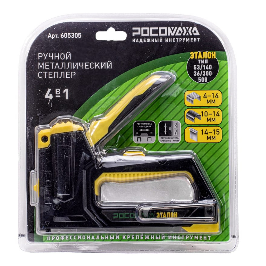Ручной металлический степлер ЭТАЛОН 4 в 1 ТМ РОСОМАХА предназначен для скоб типа 53/140/36, штифтов, гвоздей типа 300 и 500, шпилек высотой от 6 до 14 мм. Регулировка силы удара позволяет выбирать оптимальные параметры под разный тип материала.