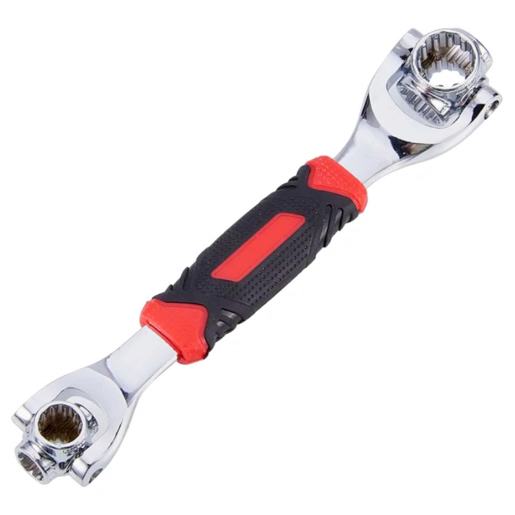 Универсальный ключ изготовлен из хромованадиевой стали, корпус ручки прорезиненный.