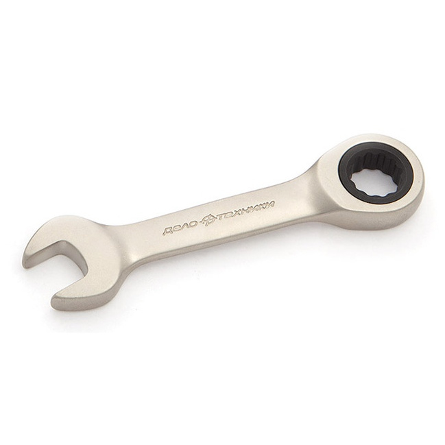Комбинированный трещоточный ключ укороченной формы для проведения слесарных работ в условиях ограниченного пространства. Изготовлен из хромованадиевой стали с надёжным 72-зубцовым храповым механизмом в накидной части.