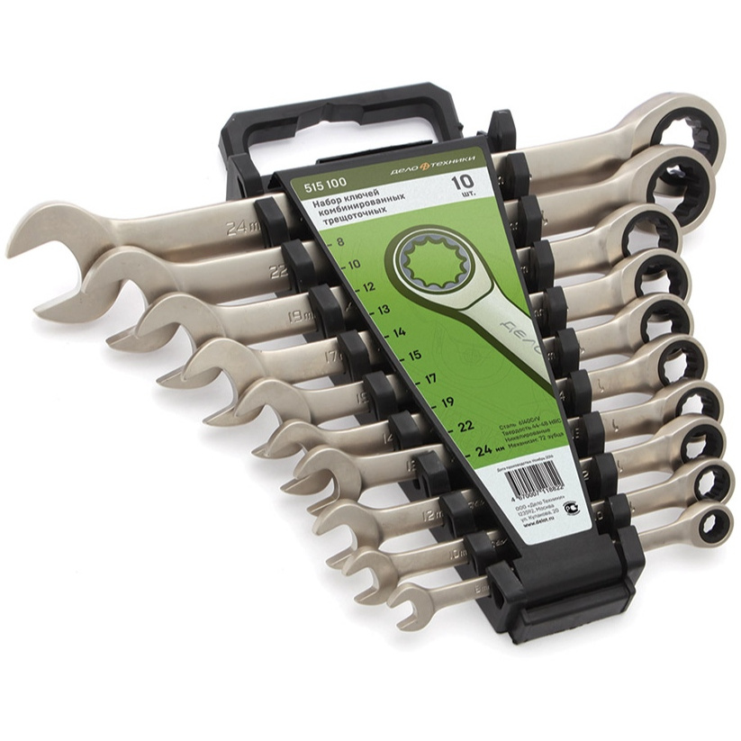 Набор комбинированных ключей из хромованадиевой стали с надёжным 72-зубцовым храповым механизмом в накидной части.