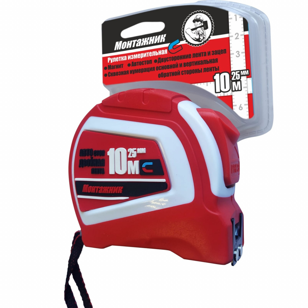 Рулетка с автостопом и магнитом ТМ "Монтажник" двусторонняя 10 м х 25 мм представляет собой удобный инструмент для работы в любой плоскости, благодаря использованию двустороннего захвата и наличию разметки с обеих сторон. Удобный корпус хорошо ложится в ладонь и не скользит. Это ускоряет процесс измерений.