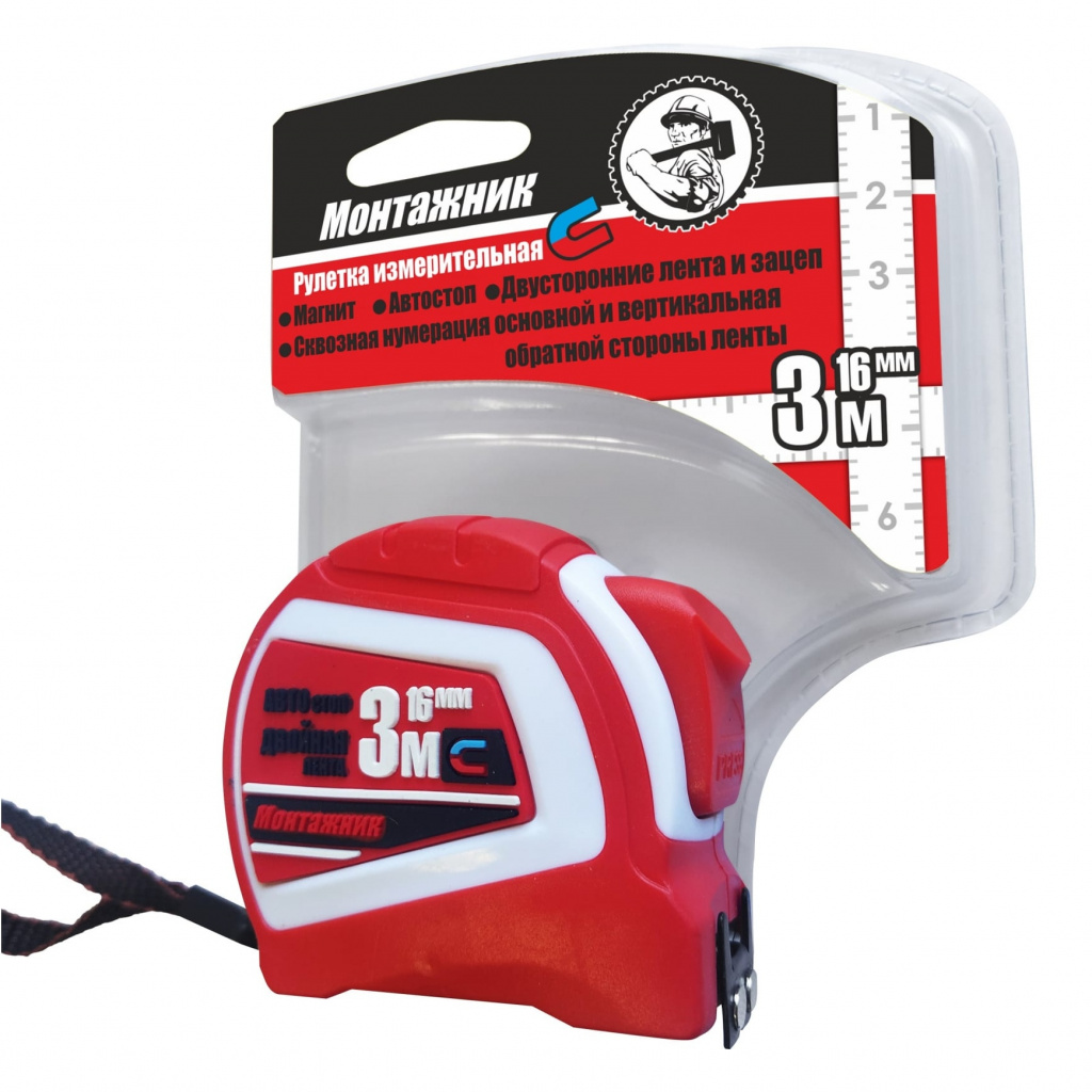 Рулетка с автостопом и магнитом "Монтажник" двусторонняя 3 м х 16 мм представляет собой удобный инструмент для работы в любой плоскости, благодаря использованию двустороннего захвата и наличию разметки с обеих сторон. Удобный корпус хорошо ложится в ладонь и не скользит. Это ускоряет процесс измерений.