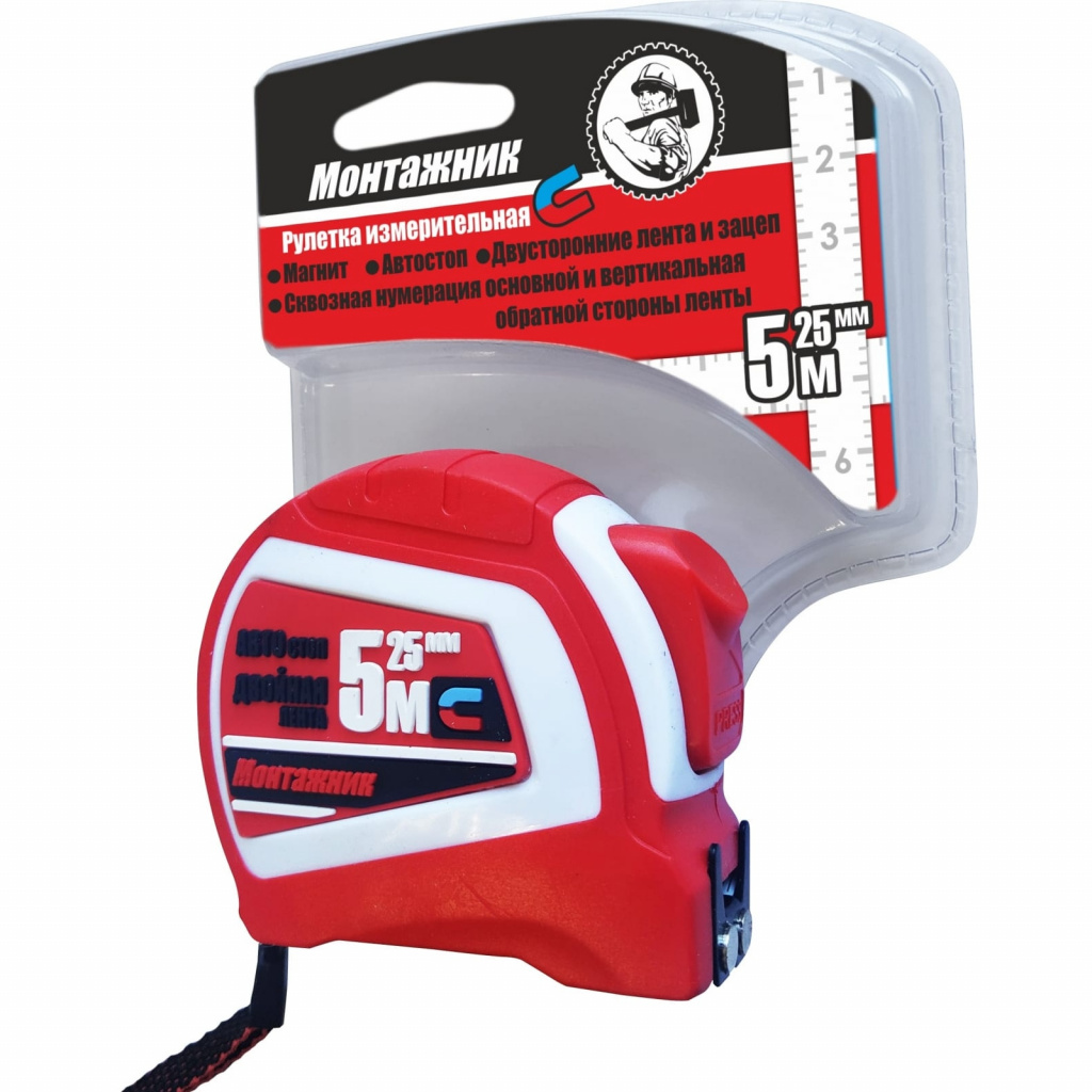 Рулетка с автостопом и магнитом ТМ "Монтажник" двусторонняя 5 м х 25 мм представляет собой удобный инструмент для работы в любой плоскости, благодаря использованию двустороннего захвата и наличию разметки с обеих сторон. Удобный корпус хорошо ложится в ладонь и не скользит. Это ускоряет процесс измерений.
