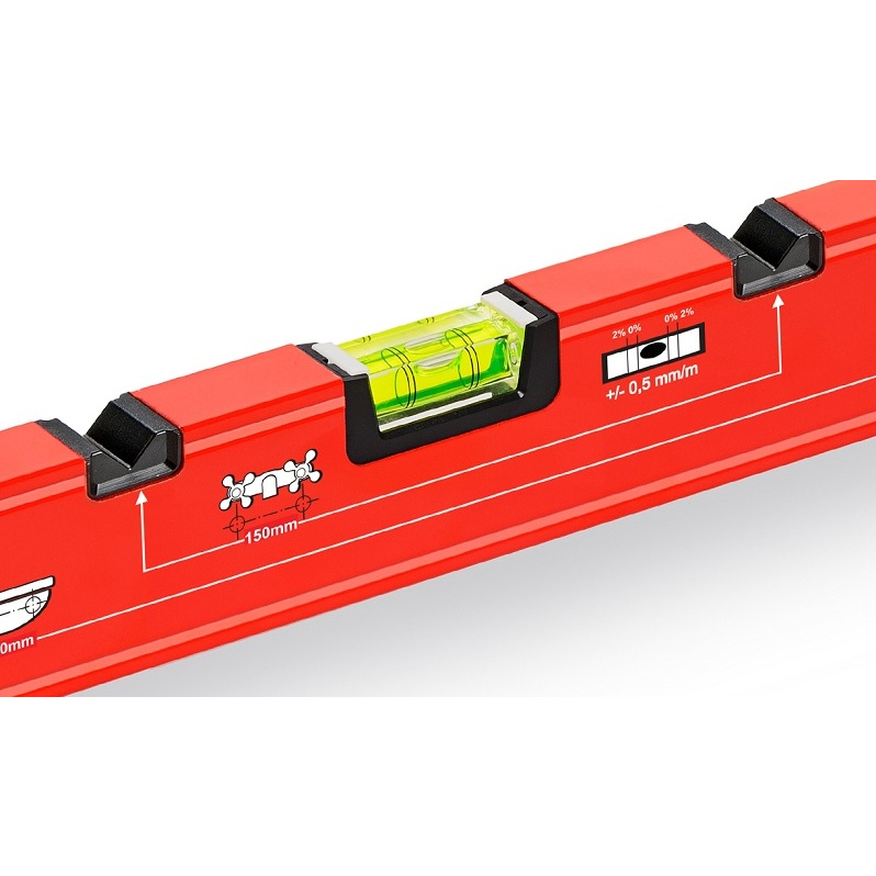 Уровень для сантехника магнитный KAPRO 108М имеет: точность: 0,5 мм; длину 70 см; 2 капсулы: вертикальная, горизонтальная; амортизирующие резиновые заглушки; усиленный алюминиевый коробчатый профиль; маркеры, встроенные в профиль уровня в стандартных точках установки раковины - 280 мм для крепления раковины к стене, 150 мм для размещения крана, 75 мм для водопроводных труб под раковиной; наличие магнитов.