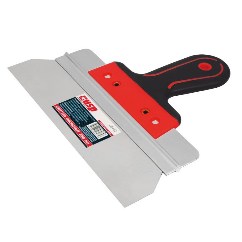 Материал: полотно из нержавеющей стали, алюминиевая планка, препятствующая деформации полотна, пластиковая обрезиненная эргономичная ручка специальной изогнутой формы.