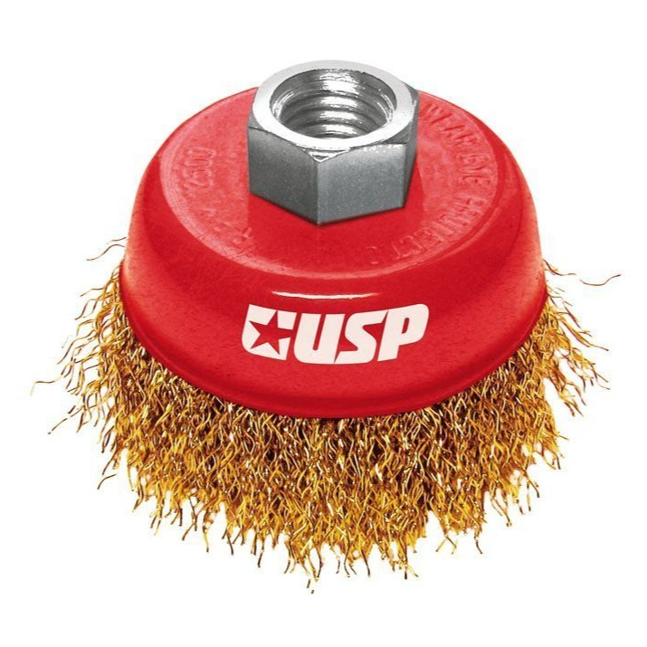 Кордщетка для шлифовальных и отрезных машин чашеобразная с мягкой латунированной стальной гофрированной проволокой предназначена для зачистки поверхностей от небольшой коррозии, заусенец.